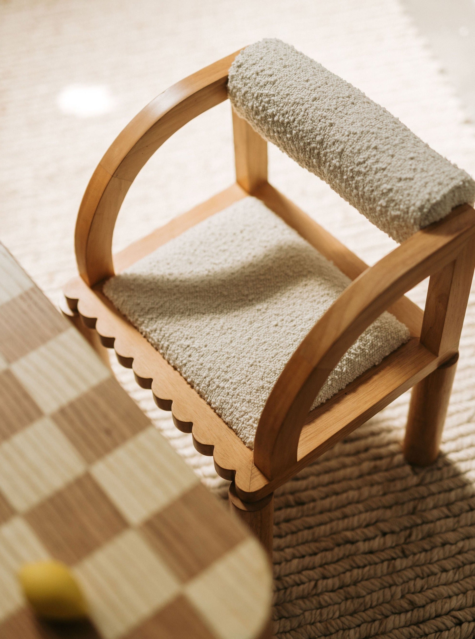 The chair's seat and backrest are artfully adorned with chic bouclé upholstery, adding a touch of elegance and sophistication to your child's space. Intricate scalloped wooden accents feature on the seat, creating a whimsical and captivating design. These details not only offer artistic charm but also make this chair an eye-catching focal point. It's more than a chair; it's a stylish statement piece.